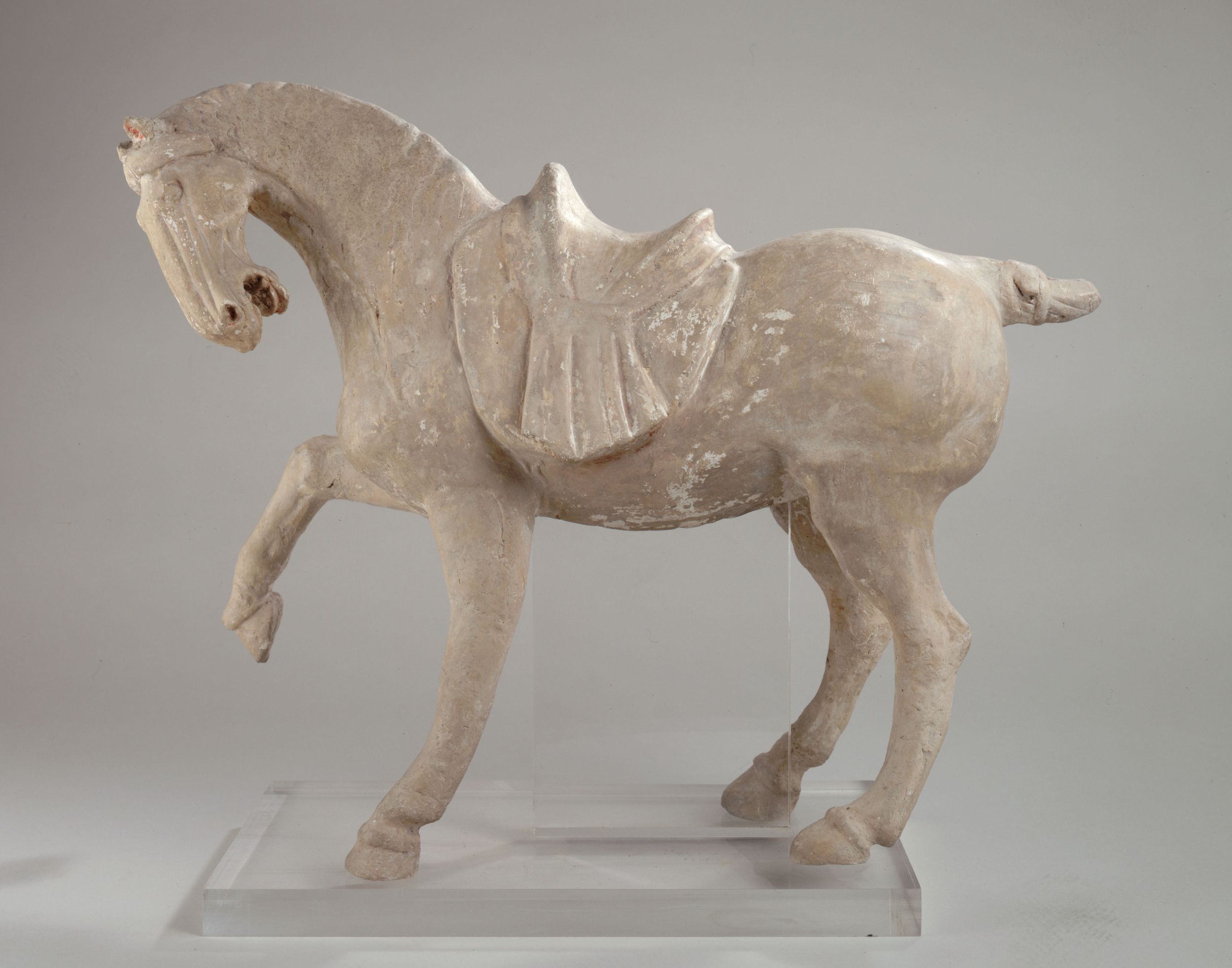 The rich equestrian iconography in Chinese tombs reflects the importance of stud farms and the equestrian arts in aristocratic circles. The stone high reliefs of the six steeds of Emperor Taizong that adorned his tomb (650) are superb examples, today divided between the Xi'an Museum and the University of Pennsylvania Museum. Ceramicists also paid careful attention to detail in the pose, breed and expressions of horses, be they the wild horses of the Han period, the harnessed horses of the Wei era or the horses performing dressage of the Tang period. Under the Tang dynasty, horses imported from the Ferghana region succeeded the small and short-legged but powerful Mongolian horses favoured during the Three Kingdoms and Six Dynasties periods. An increasing number of mingqi (funerary figurines) furnished tombs in the 8th century. For example, a medium-sized tomb such as that of the prince Huizhang (724) in Shaanxi contained no fewer than a thousand of them, half of which were equestrian figures. Horses performing dressage, as is the case in the two Cernuschi Museum ceramics, wild or harnessed horses, galloping horses ridden by warriors, falconers, female dancers, musicians or polo players: all were depicted in the form of ceramics. Besides painted terracotta, numerous horse mingqi had a “three-colour” (sancai) lead glaze with metal oxides to render the animals’ chestnut or piebald coats.