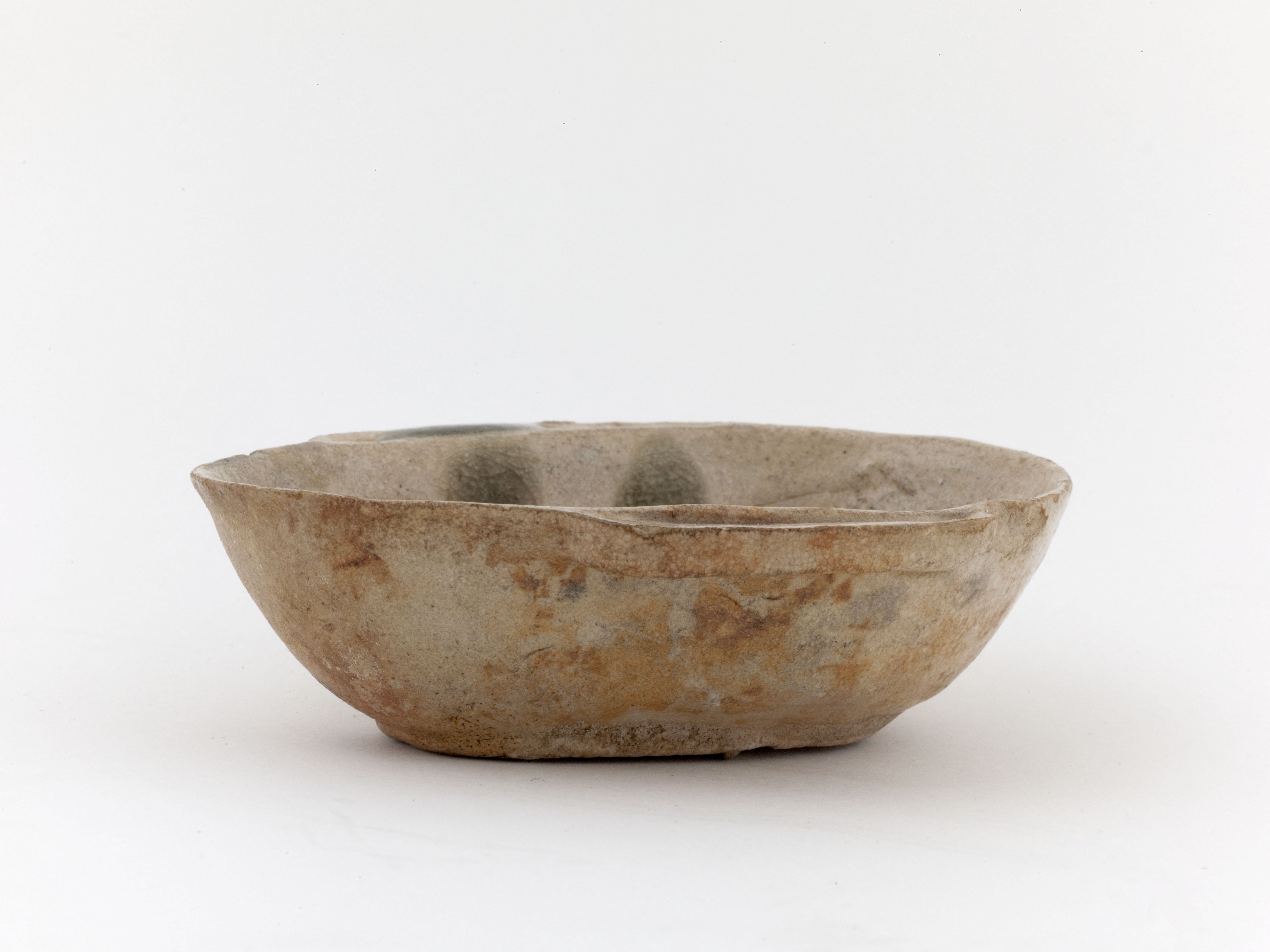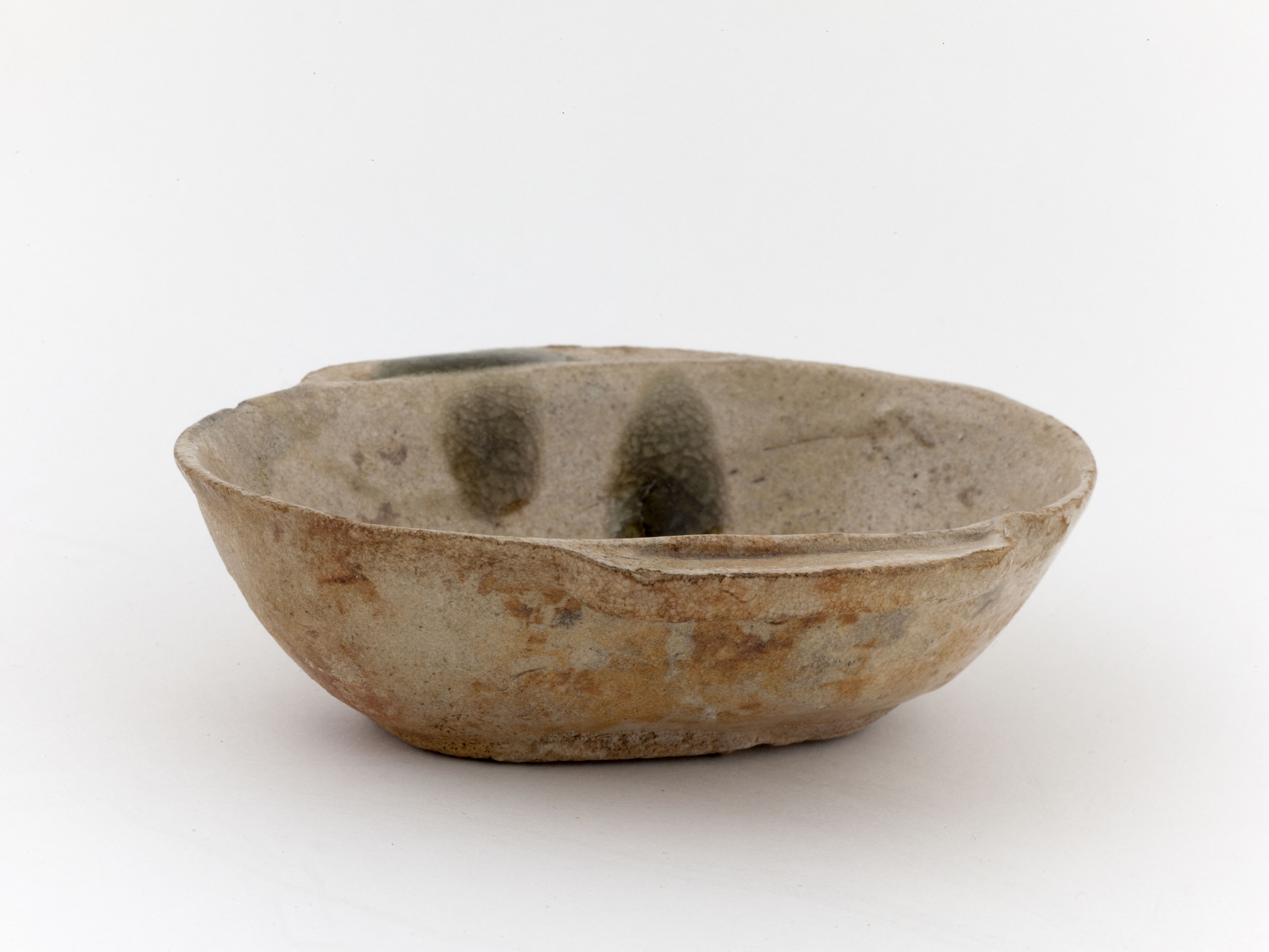 Items placed in the tomb reflected those actually used by the aristocratic classes of the time. But ceramic was used a substitute material, because even if the wealthy alone could afford the luxury of being buried in tombs along with tableware and jars filled with food, certain objects were so luxurious that they were reproduced in clay. This dish with handles, inspired by lacquered wooden dishes that were common in China from the 5th century BC to the 3rd century AD is an example. Tableware in lacquered wood was the most highly prized and expensive, because it was light, smooth to the touch and required months of work for the thin layers of lacquer to dry. Here it is reproduced in white ceramic and in miniature, with a few drips of green enamel splashed dynamically on its surface. Perhaps they serve to conjure up the brilliance of lacquer, silver or bronze. Ancient Chinese texts describe the rules governing funerary practices and recommend using only objects that are different to objects used in the living world.