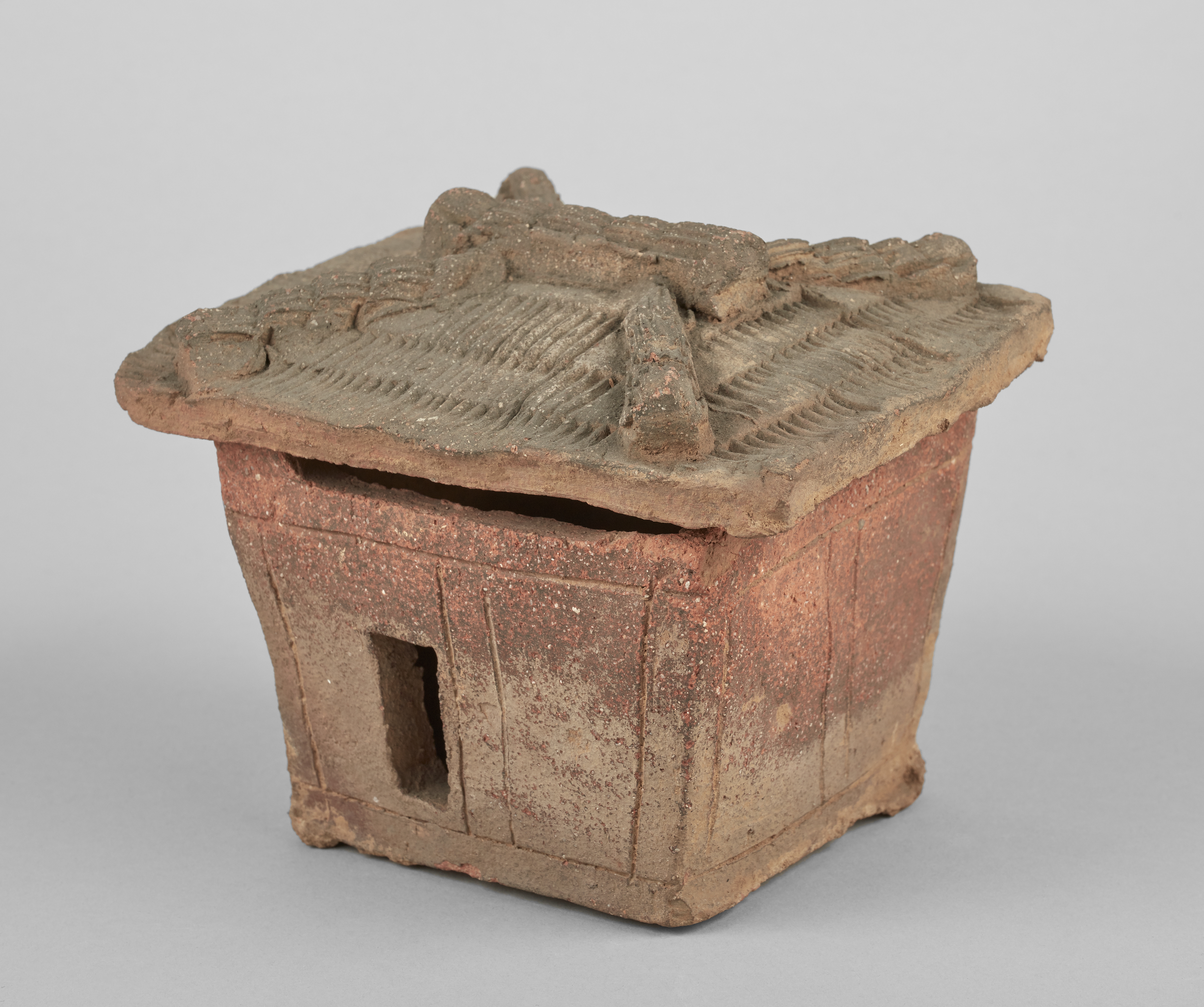 Architectural models belonged to this tradition, representing the source of wealth of the deceased landowners. The details of these miniature houses provide information about the architecture of the period: lines incised in the walls indicate that they consisted of a bamboo lattice covered with mud, fixed on a wooden structure of posts supported at the top and base by horizontal beams. The flared shape of the buildings protected the base of the walls from trickling water in rain. The rush-thatched roof was held together with bamboo ridges.