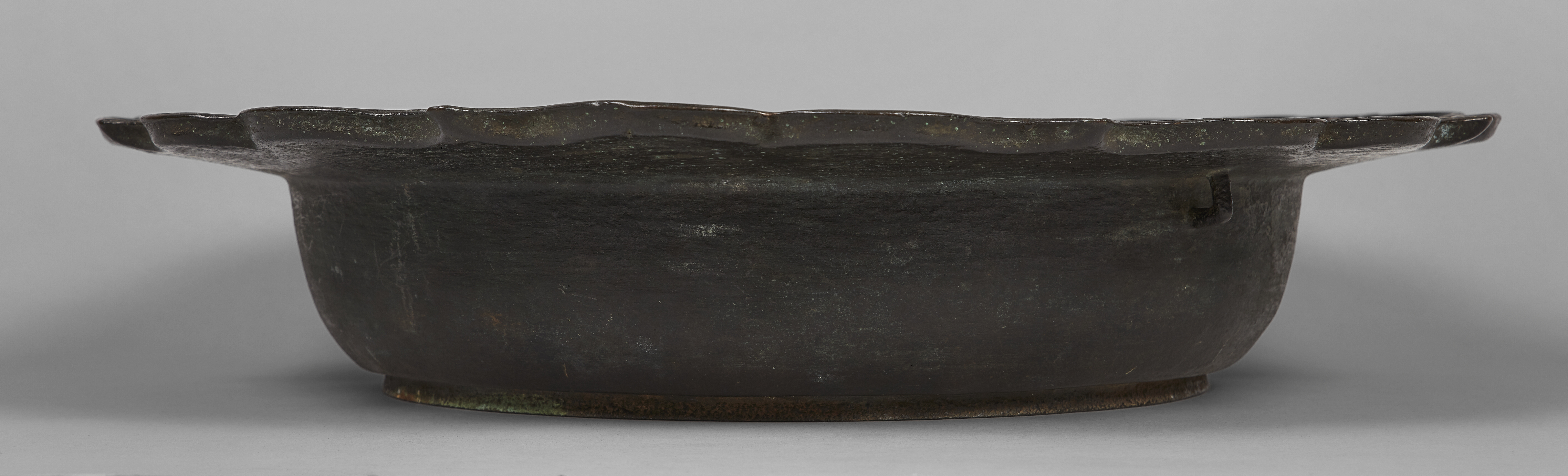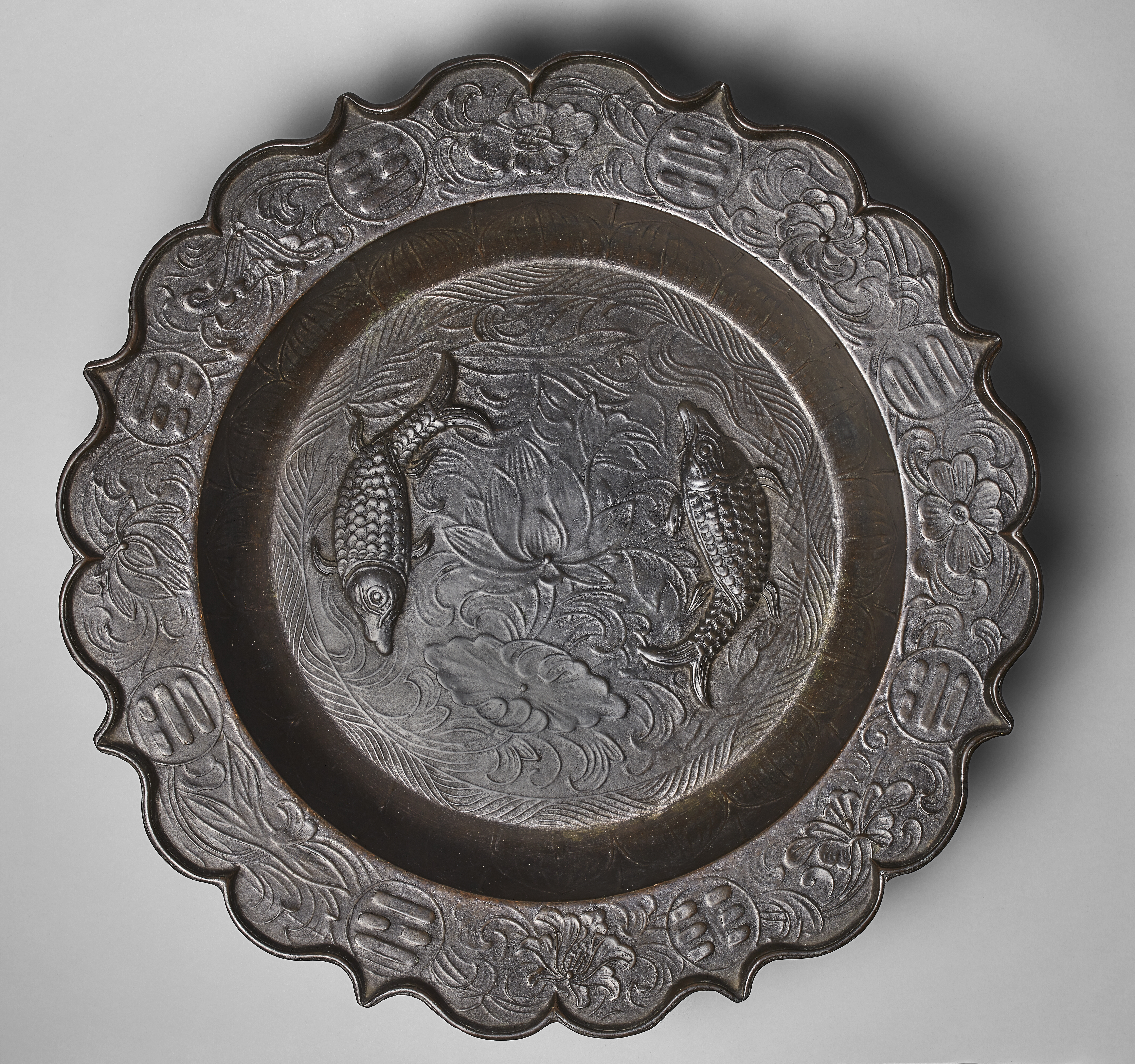 Au centre, les deux motifs de poissons sont une réminiscence ou, plutôt, une évocation de ce même motif présent dans les bassins de l’époque des Han ; ici, ils sont traités selon un style très différent, sur un fond de lotus. Sur la bordure, les huit trigrammes divinatoires (bagua 八卦) du Yi jing (Livre de la divination) apparaissent au milieu de rinceaux floraux. Des bassins de même forme, ornés d’enfants porteurs de lotus, existent également.