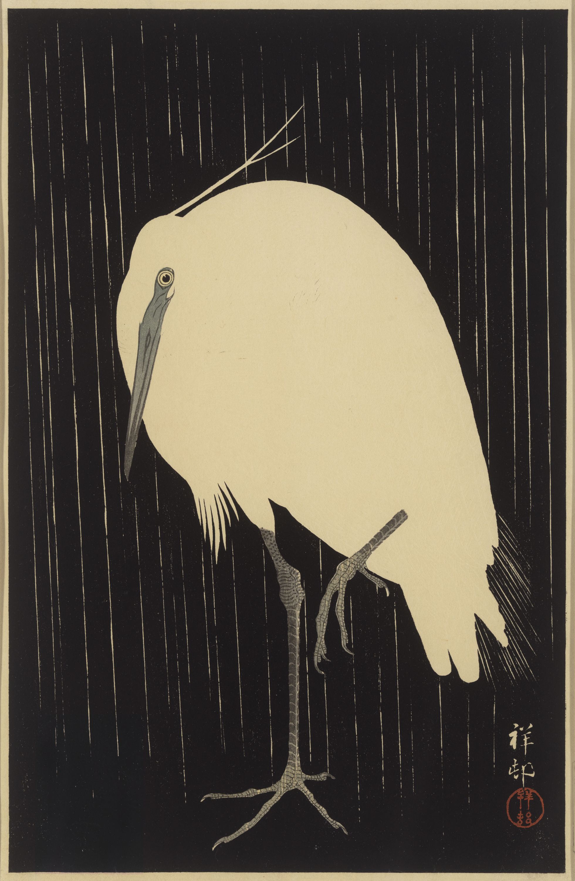Cette œuvre, qui compte parmi les images les plus saisissantes de Koson, montre une aigrette blanche sous une pluie battante figurée à l'aide de lignes verticales laissées en réserve. Les plumes de l'oiseau, dont la silhouette se détache sur un fond noir profond, sont rendues suivant le procédé du gaufrage (karazuri). Cette méthode permet d'obtenir le relief de certains éléments par l'impression de la matrice de bois gravée en creux, sans couleur.