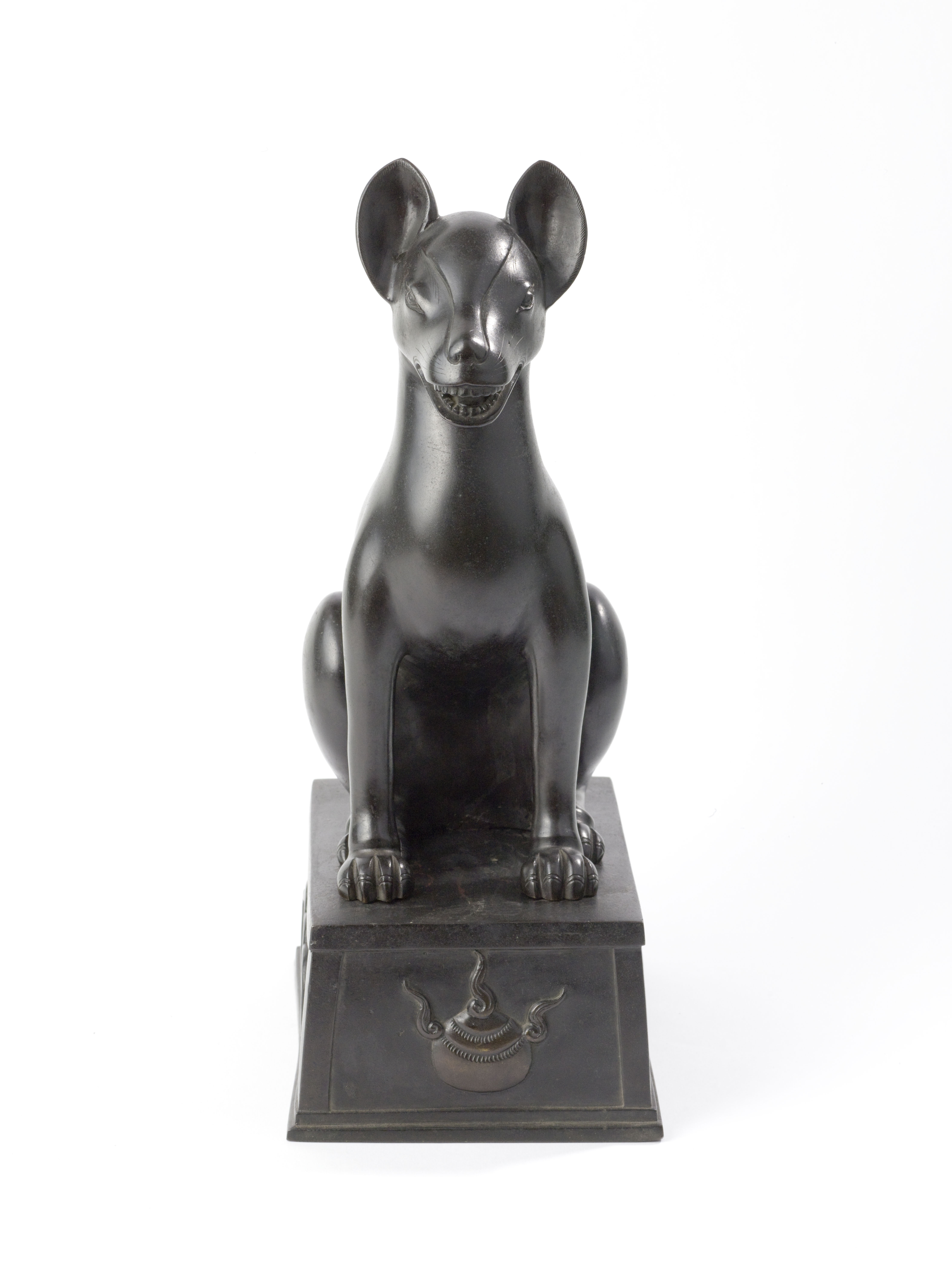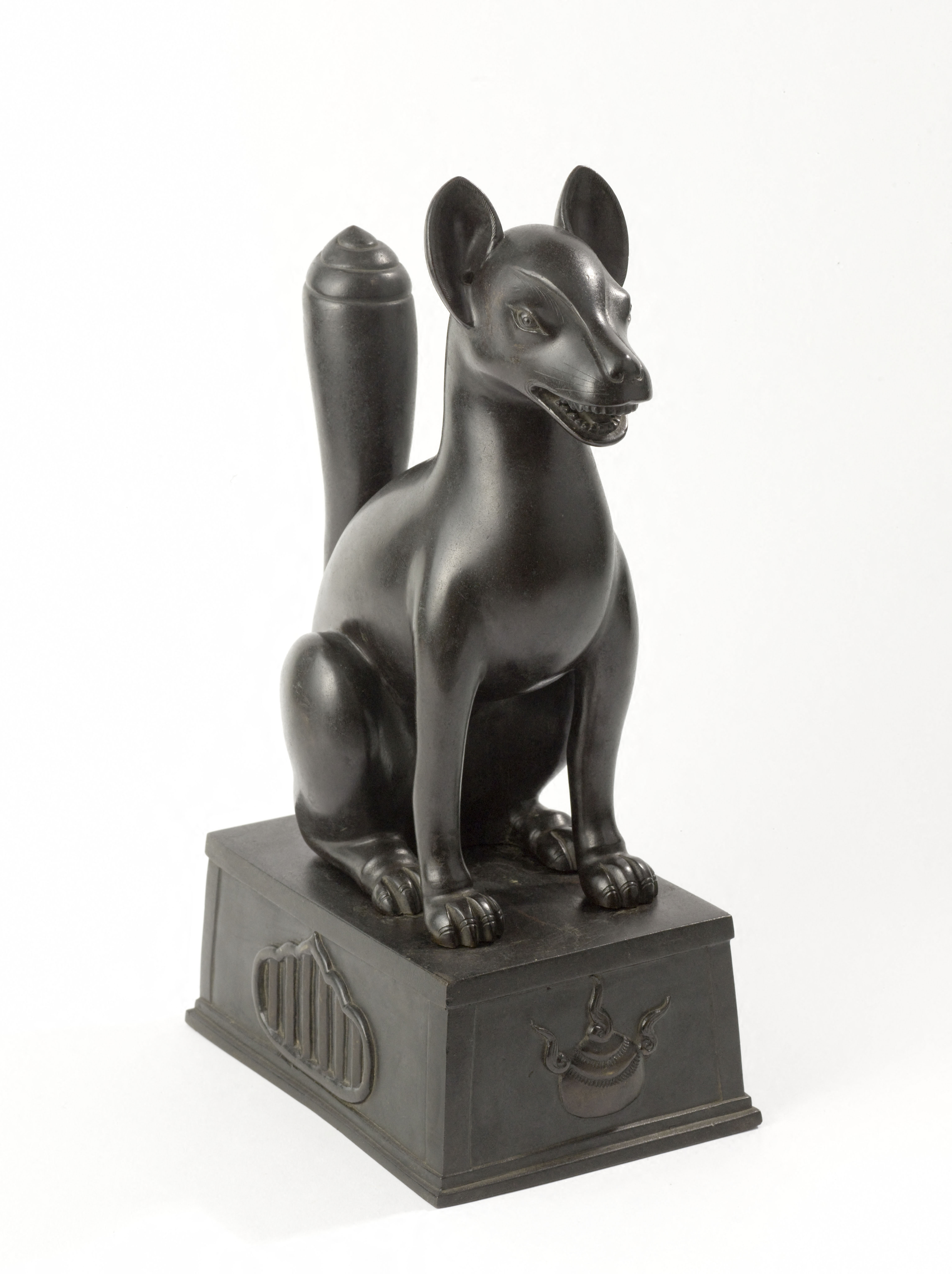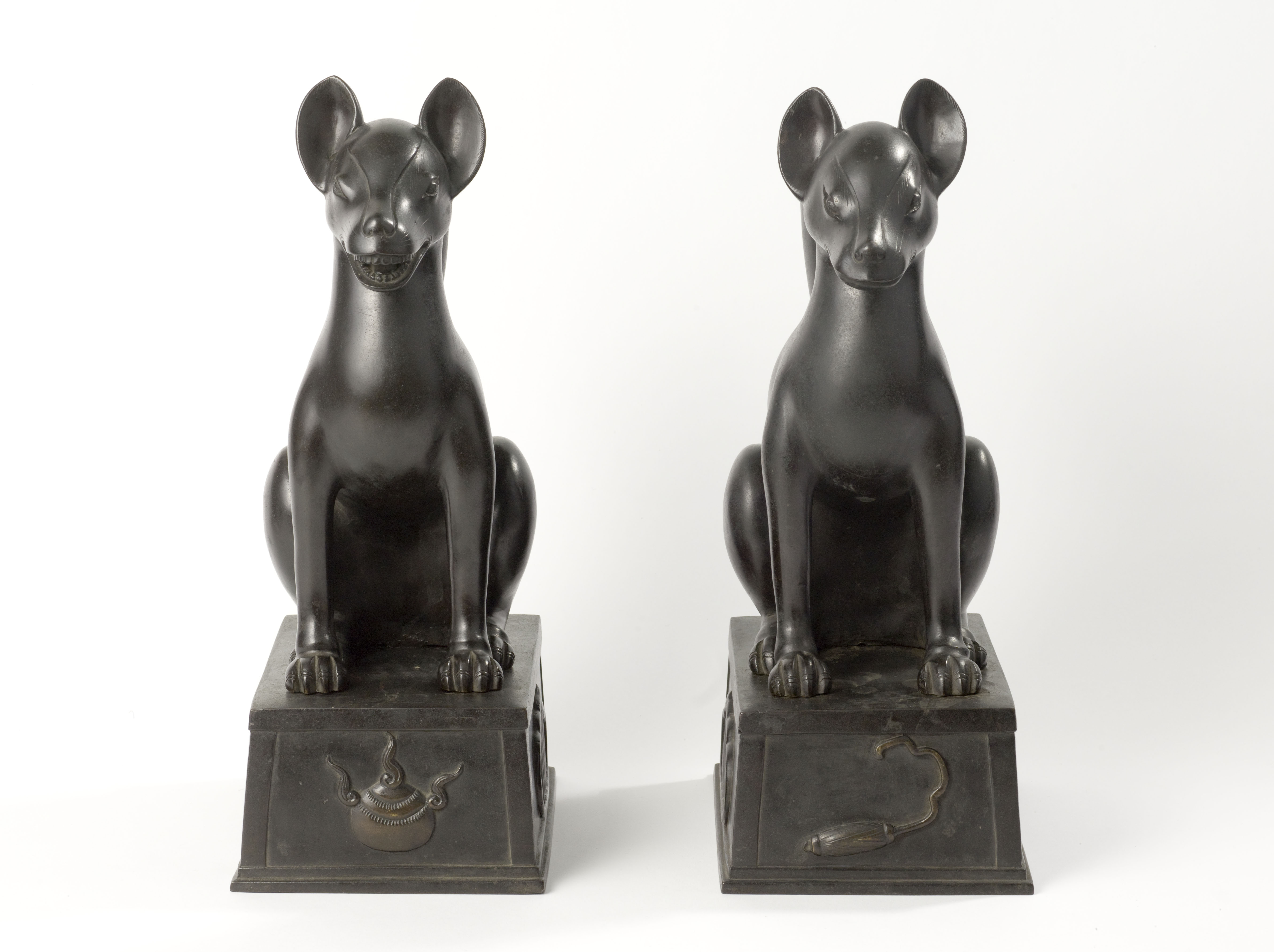 Les renards accompagnent la divinité Inari, dieu de la récolte. Aujourd'hui encore, au Japon, il est de coutume de dédier des représentations de couples de renards à Inari. Les deux idéogrammes formant le nom de la divinité signifient littéralement "Charge de riz". Le riz étant l'aliment de base du régime alimentaire japonais, Inari est l'une des plus importantes divinités shintō. Il y a d'innombrables sanctuaires qui lui sont consacrés dans tout le Japon. Ici, les deux animaux sont représentés sur deux socles décorés respectivement d'un bijou bouddhique et d'une clé. Ce type de sculpture, qui n'a pas de fonction ornementale, est connu sous le terme d'okimono ("objet posé") en japonais.