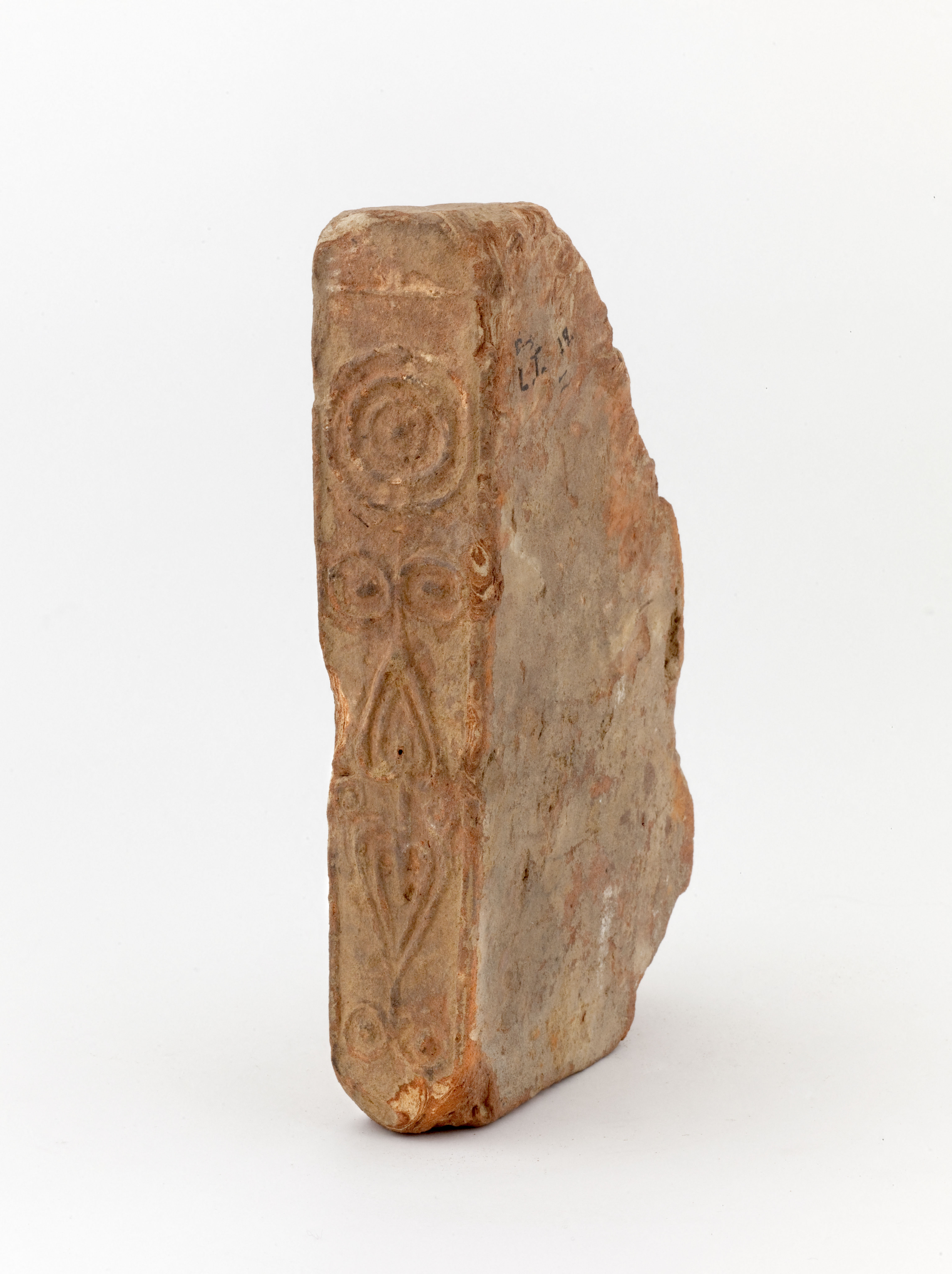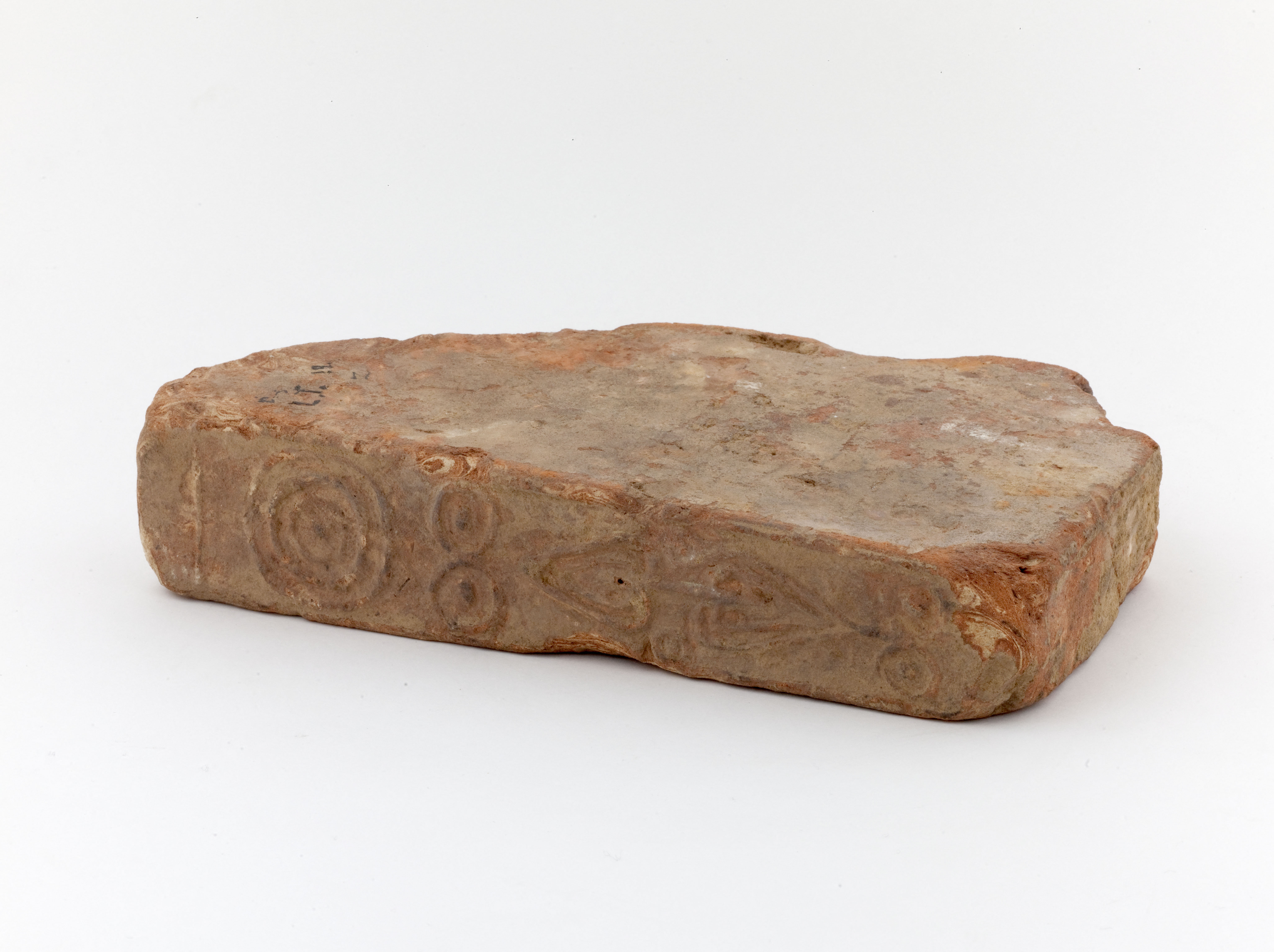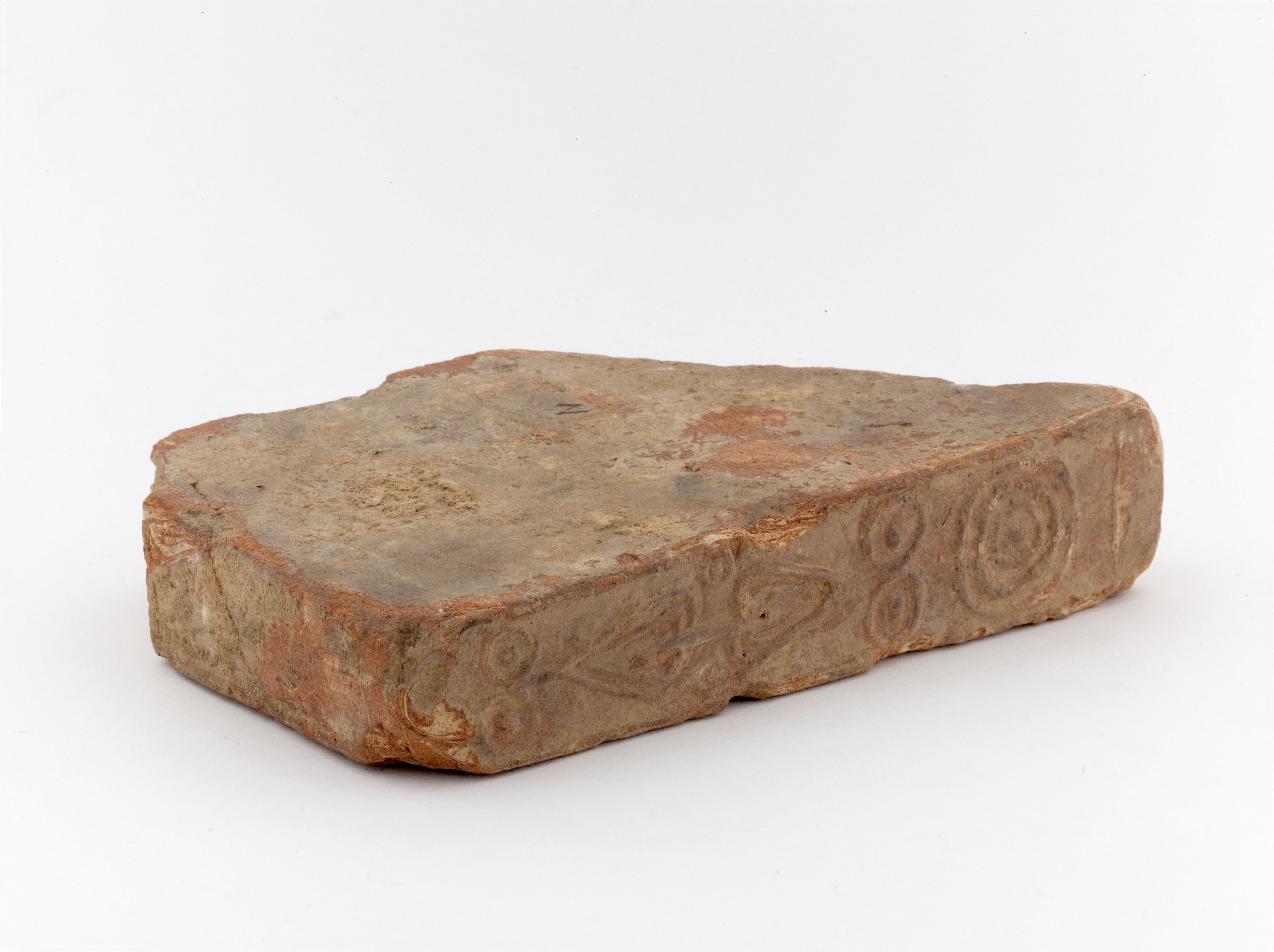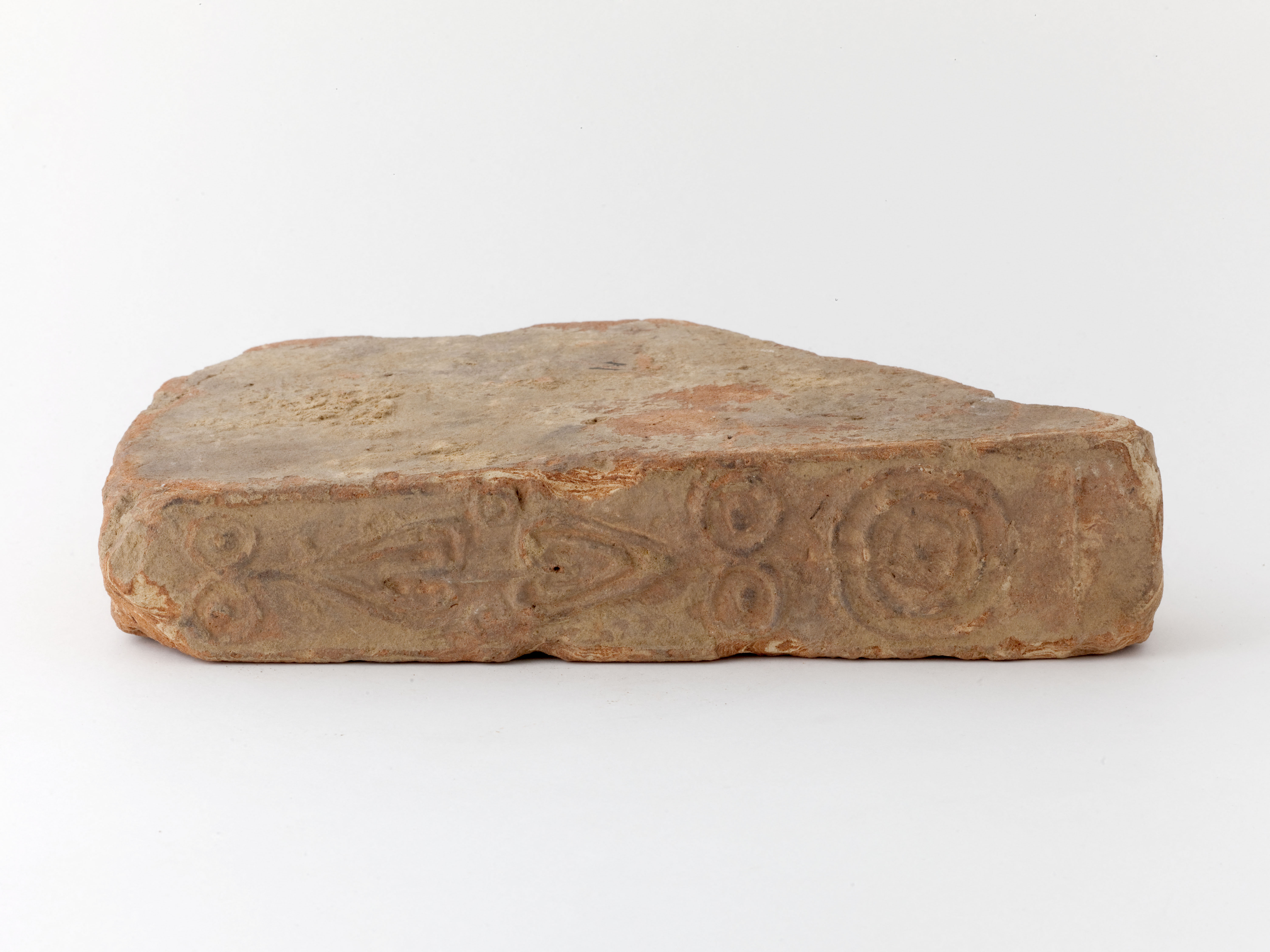 À partir de la révolte des sœurs Trưng, de 40 à 42 de notre ère, la Chine administra le nord du Vietnam de manière plus directe que précédemment. Le nouveau mode d’inhumation dans de vastes caveaux en briques introduit par les colons chinois remplaça progressivement les fosses plus simples de la culture de Đông Sơn. Pourtant, des réminiscences des motifs décoratifs dongsoniens apparaissent encore sur le décor estampé de certaines briques. Celle-ci présente un décor de trois cercles concentriques autour d’un point. De ces cercles émane un axe auquel s’accrochent quatre autres cercles pointés et deux cœurs.
