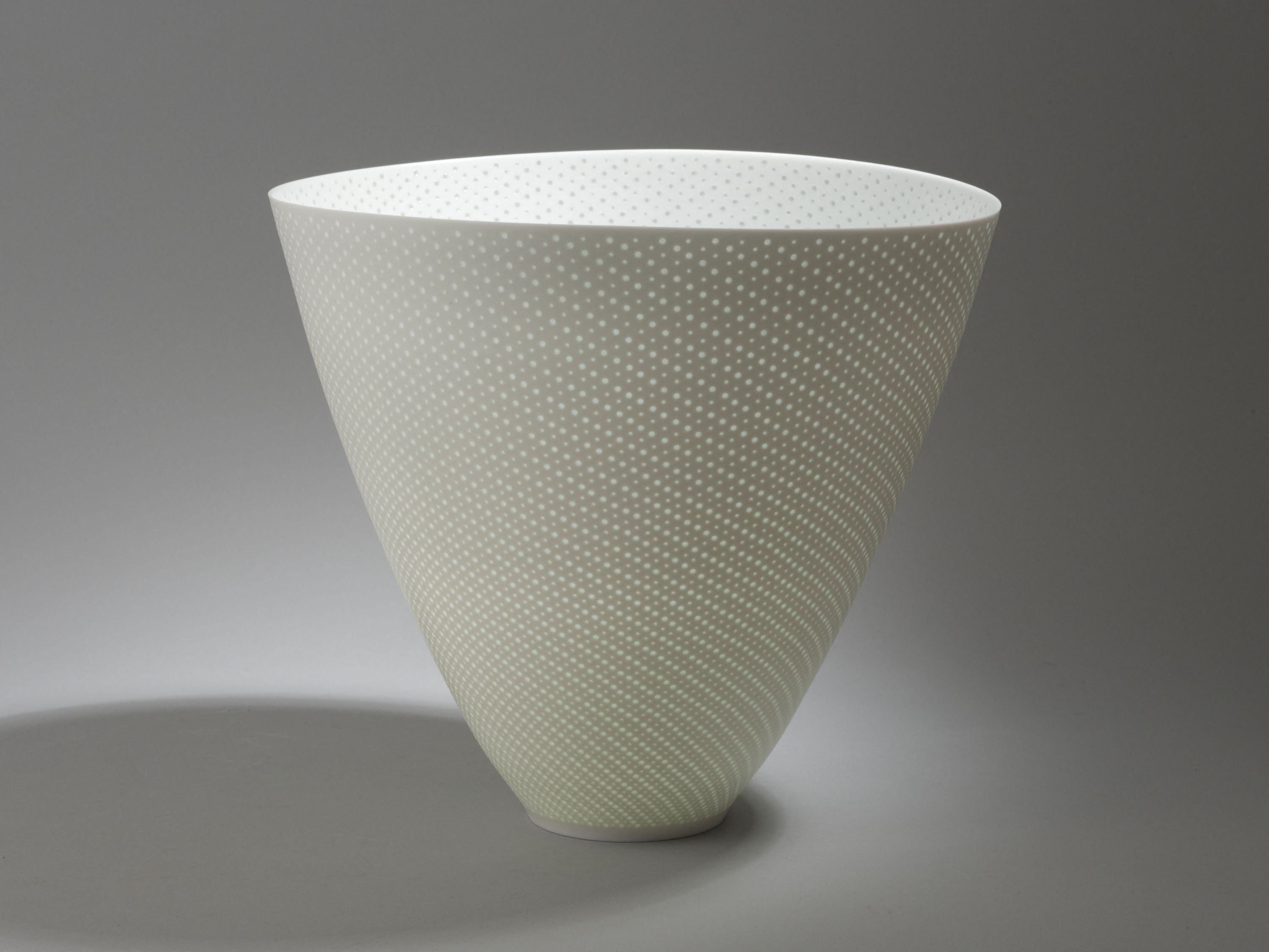 Contemporain de Takeuchi Kôzo, Niisato Akio est né la même année, mais est originaire de la préfecture de Chiba. Toutefois, leurs recherches sont fort différentes. Luminescent vessel montre l'obsession de Niisato pour la translucidité de la porcelaine. Selon lui, ses récipients sont des "contenants à lumière". Pour un effet de transparence maximale, la pièce est tournée jusqu'à l'obtention de parois extrêmement fines. Celles-ci sont ensuite arasées et percées avec un outil électrique, rappelant lointainement les "grains de riz" des porcelaines chinoises. Après un dégourdi, une couverte translucide est appliquée d'abord à la main sur les trous, puis à l'aide d'un compresseur sur l'ensemble de la pièce. Plusieurs cuissons s'avèrent nécessaires afin de combler les trous.