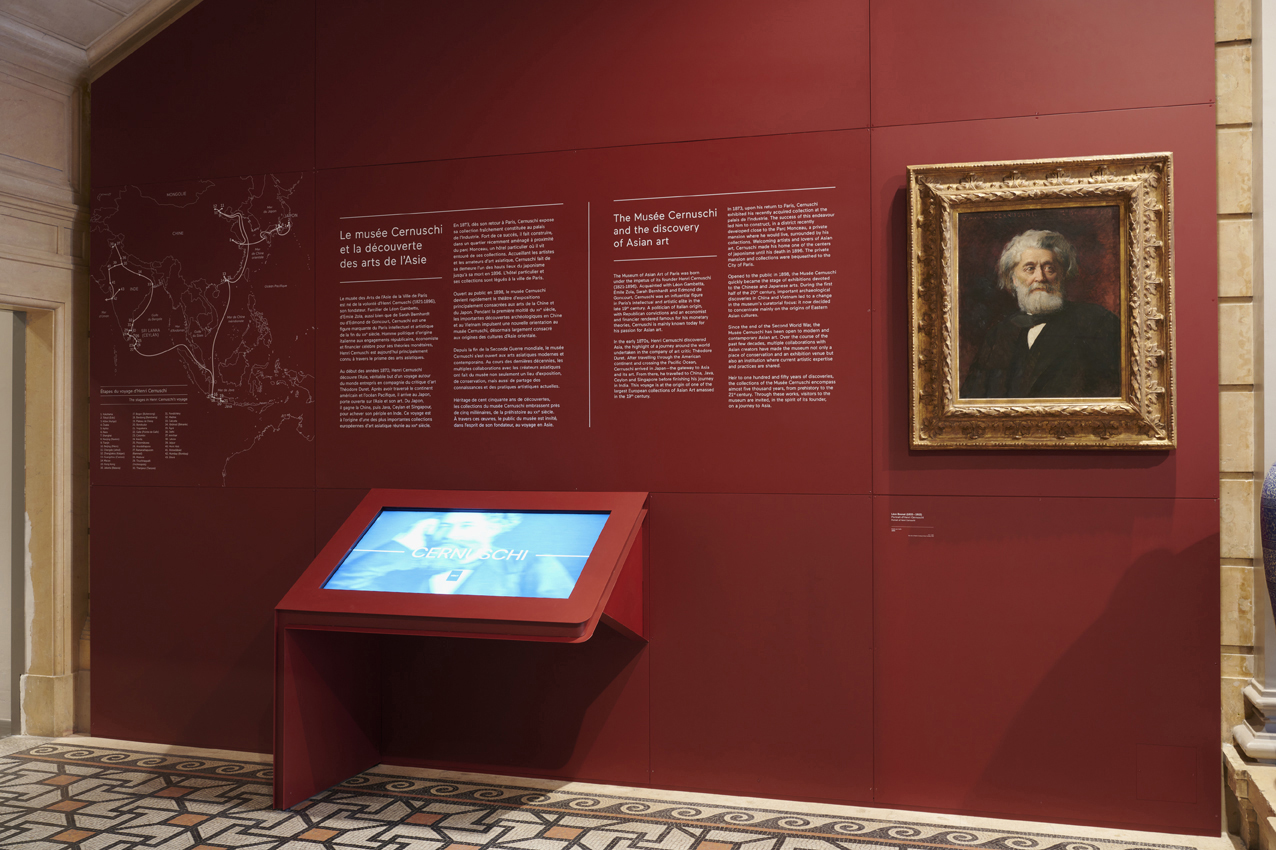 Une grande table tactile introduit le nouveau parcours des collections, telle une invitation au voyage sur les pas d’Henri Cernuschi. Quatre thématiques y sont développées :