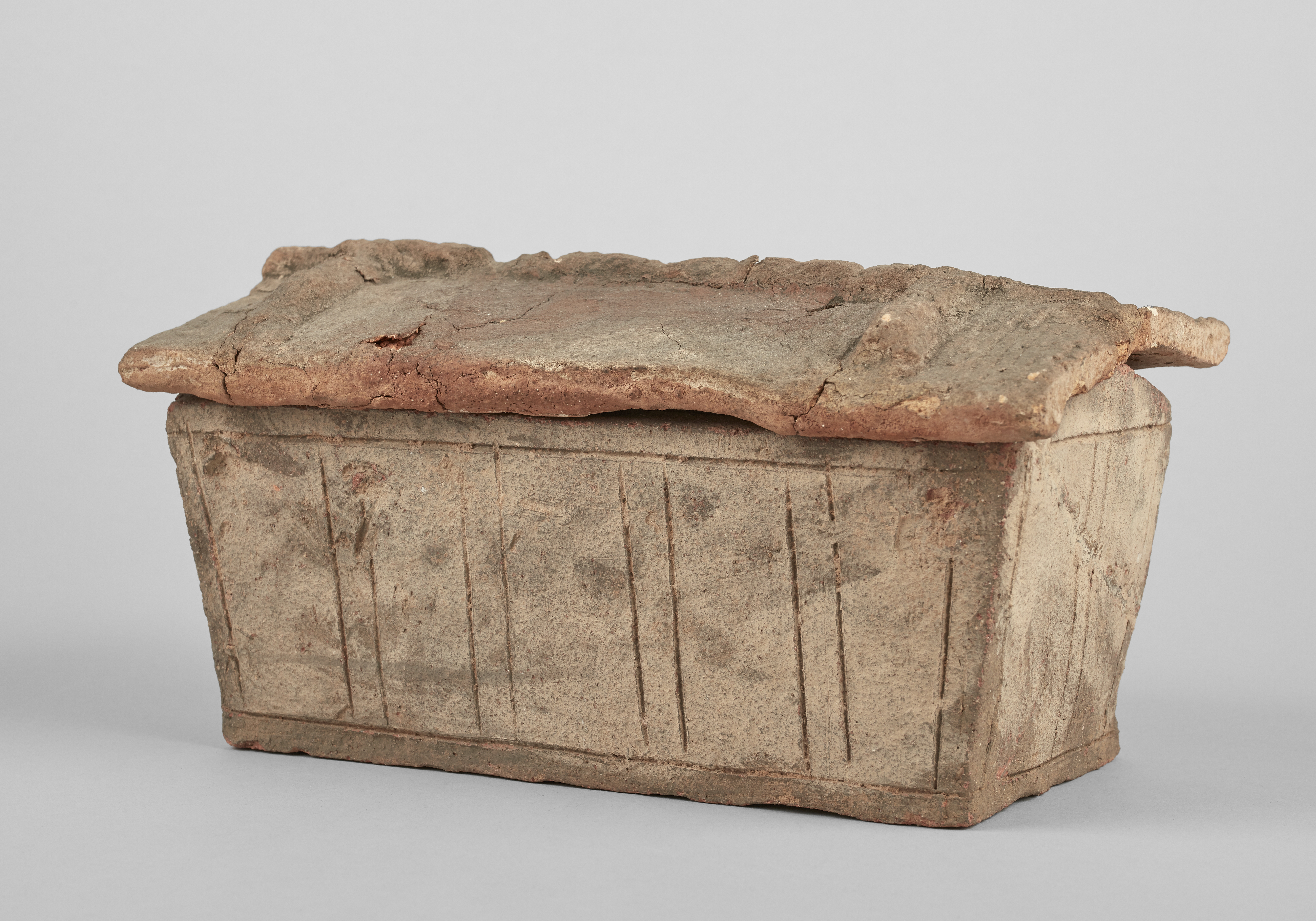この開口部のない家は、かなり粗いオレンジがかったピンク色の粘土で形成され低い温度で焼かれている。正面には浅浮彫りで戸口の額縁が示されている。ふたつの垂直の立ち上がりの間に、上の部分に、水平の凸凹が二つ、分離を示しており、もしかしたら高窓に当たっていたのではないか。妻壁と土台は正面から張り出しており、建物の敷居の上に一種の軒を作っている。この措置は、この家がもっと大きな教科された住居全体のなかで二重の壁の上に載れるようにしたものかもしれない。したがってこの品は個人の家としてではなく四角く堅固な器の形をした基底部の上に建てられた家屋の一つとして考えるべきなのだろう。