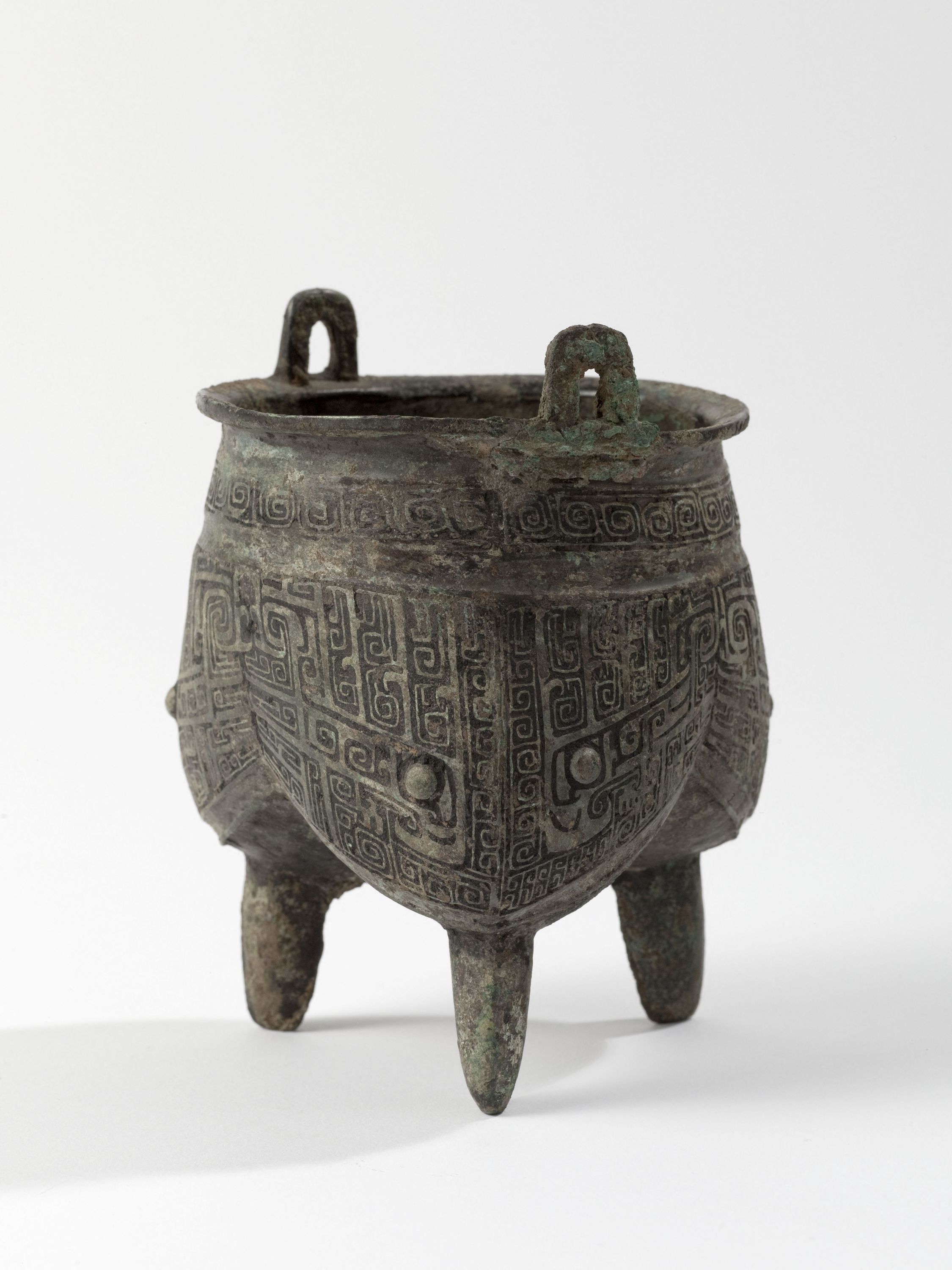 Cette pièce est l’un des rares bronzes du début de l’époque de Anyang conservés au musée. Au-dessus des trois pieds, les masques de taotie, peu explicités, malgré l’importance accordée aux yeux globuleux, sont constitués par deux dragons de type kui affrontés, au dos hérissé de projections en silhouette de hallebarde. Les multiples entrelacs, évoquant le caractère lei, « tonnerre », se mêlent aux dessins des monstres et ne constituent pas encore un décor tapissant bien distinct comme ils le seront dans la dernière phase de la production de Anyang. On remarquera le registre supérieur occupé par ces « motifs du tonnerre », leiwen en doubles boucles spiralées et emboîtées. Sur toute la surface de la pièce, les incisions sont remplies d’une pâte noirâtre peut-être du quartz mêlé à de la cuprite, afin de rendre le décor plus lisible. Ce procédé, bien que rare, se rencontre sur d’autres pièces. Il peut être authentique mais peut également avoir été rajouté par un collectionneur des derniers siècles.